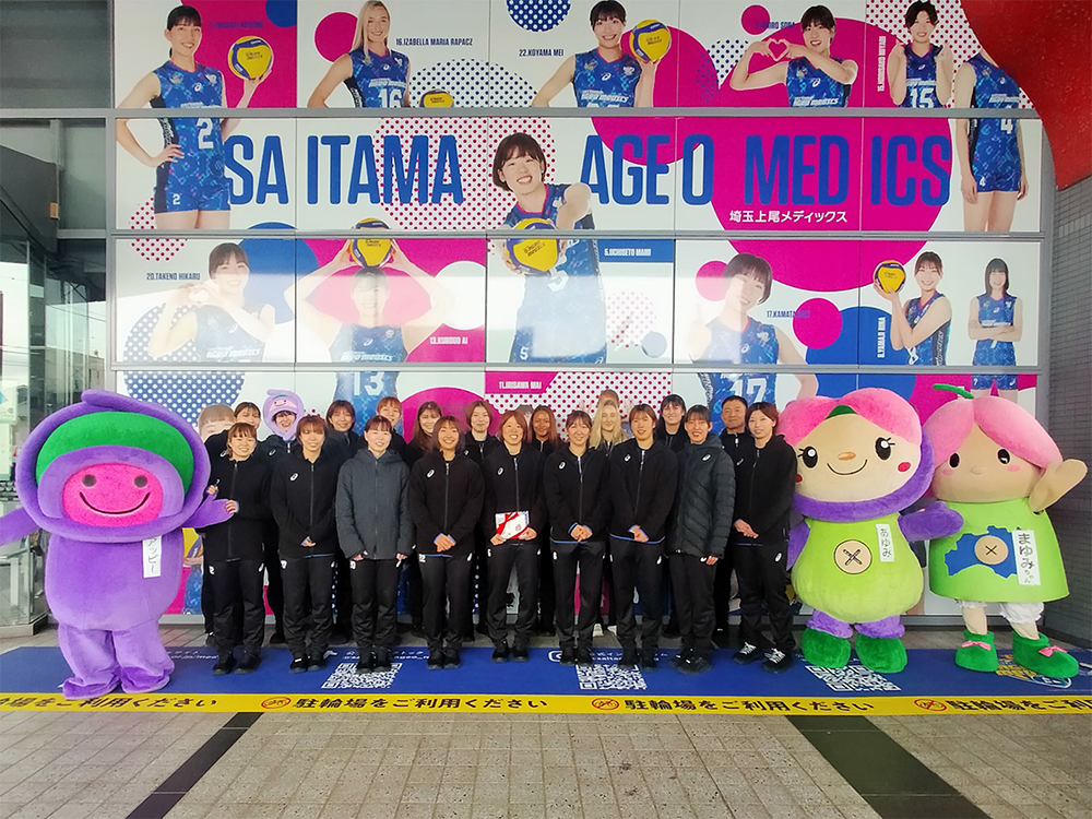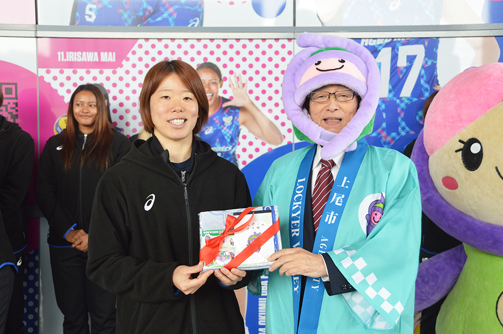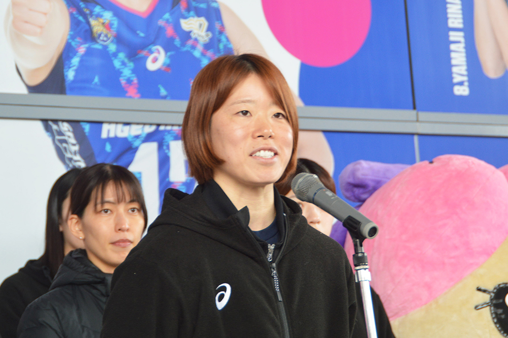 大勢のギャラリーに囲まれ、上尾市長や後援会副理事長から激励の言葉をかけられると、選手を代表して内瀬戸真実キャプテンが「素敵なイメージシートをありがとうございます。今シーズンは選手、スタッフ、そして応援してくださる皆様と一緒にスローガンである『一丸』を体現し、優勝を目指して頑張りたいと思います。またバレーボールの力で上尾市をいっそう盛り上げていきたいと思います!」とリーグに賭ける意気込みを力強く語りました。